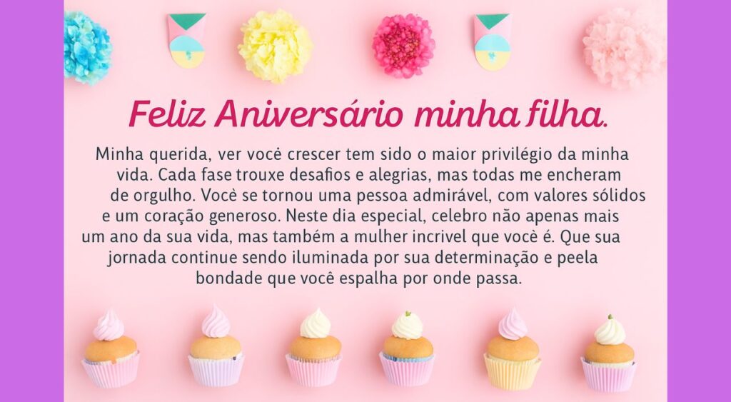 Filha, você é o melhor presente que a vida me deu. Cada dia ao seu lado é uma oportunidade de amar mais intensamente e de aprender com você. Neste aniversário, quero que você saiba o quanto me orgulho de quem você se tornou. Você é uma mulher forte, inteligente e sensível. Que este novo ano seja marcado por realizações maravilhosas e por muita felicidade. Continue seguindo seus sonhos com determinação e nunca desista diante das dificuldades. Você é capaz de coisas extraordinárias. Te amo infinitamente, minha filha amada. Parabéns.